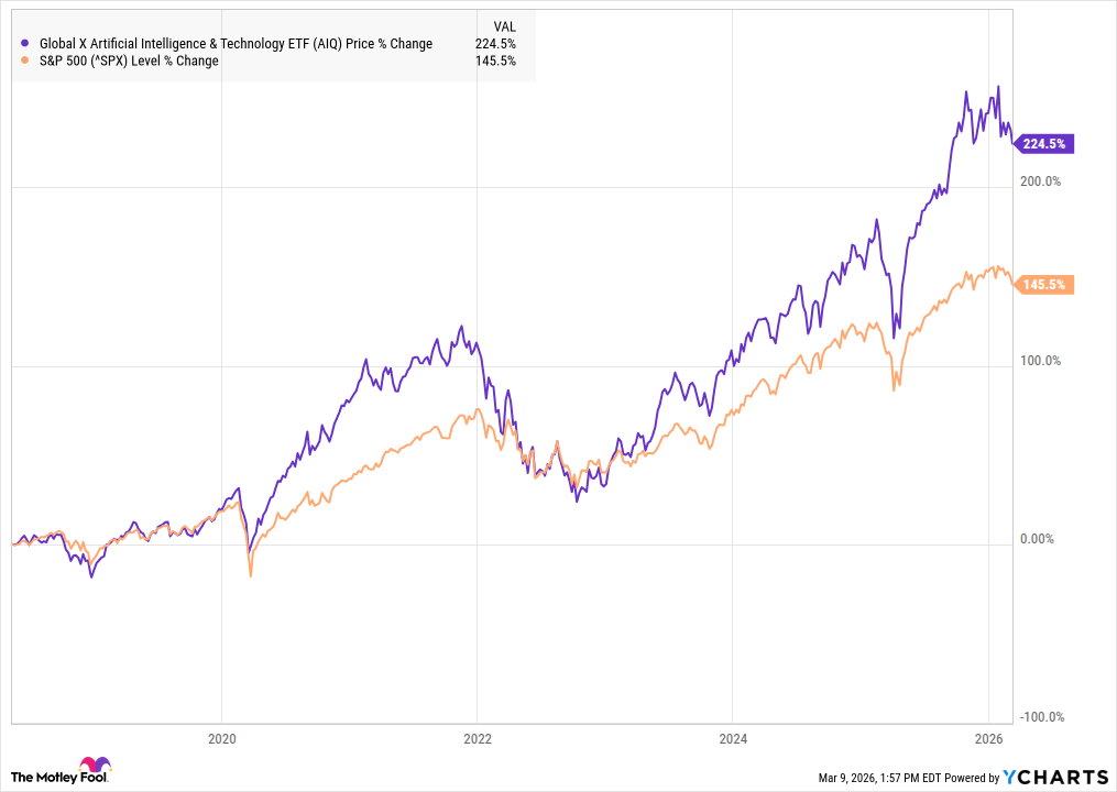 5 Best AI ETFs to Buy in 2026 | The Motley FoolAIQ vs S&P 500 비교 차트(2020~2026) 보면 AIQ가 224.5% 올라 NAV 성장 잘 지키지만, 옵션 ETF는 상황이 다르다.